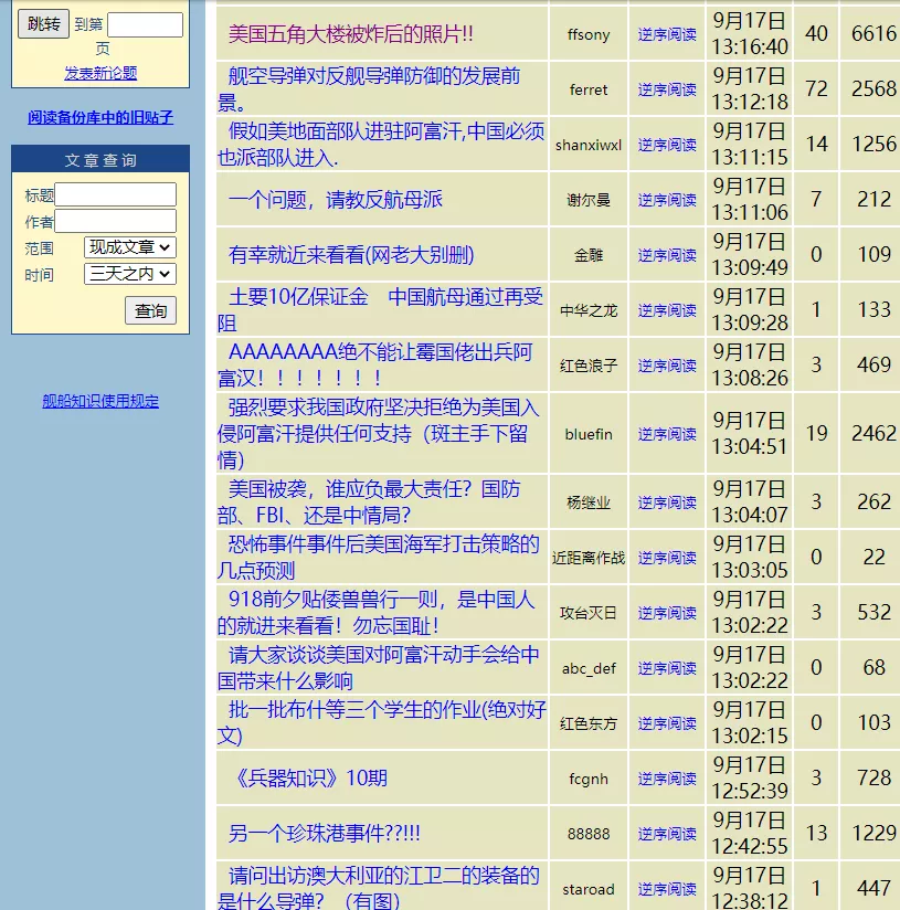 新浪論壇並沒有軍事和國際板塊,點擊它的軍事板塊會跳轉到《艦船知識》網站,關於911,我們可以看看當年的人的説法: