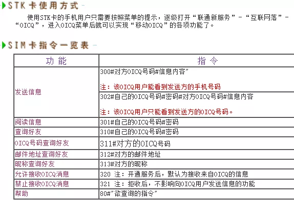 和當時所有的互聯網公司一樣,騰訊當年也是靠移動吃飯的,當時OICQ還有個別名,叫移動尋呼機,移動QQ首次集成於移動電話的STK卡中,用户可以執行基本的聊天功能,如收發信息、查詢用户信息,查找發送方式相當的麻煩,如下