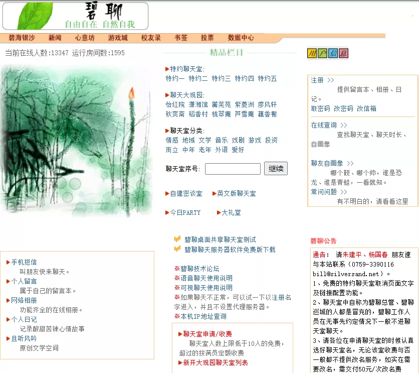 2001年由於互聯網還沒有大規模鋪開,人們上網也不知道玩什麼,聊天室是人們的常去處,當時有一個特別出名的聊天室叫“碧海銀沙”: