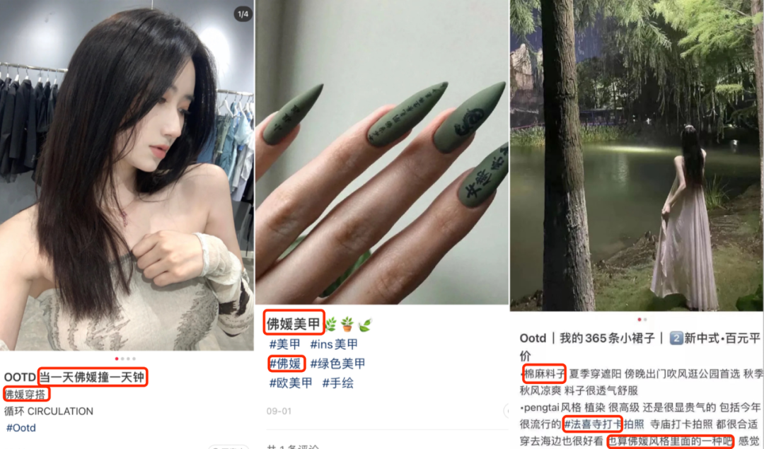 一旦佛媛成為流量關鍵詞,各路人士都開始借它為自己引流,一些過去與“佛”毫無關係的穿搭和美妝博主,也給自己打上了“佛媛”的標籤。