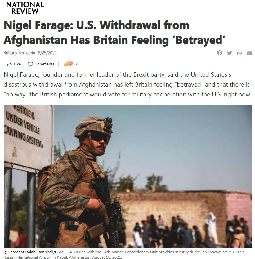 《National Review》:英國脱歐黨的創始人和前領導人奈傑爾·法拉奇表示,美國災難性地從阿富汗撤軍讓英國感到“被背叛”,英國議會現在“不可能”投票支持與美國的軍事合作。
