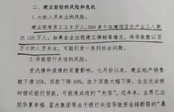 在河南和業內都赫赫有名的本土房企建業集團如今也撐不住了,9月9日,一份《關於企業出現重大風險和危機並請求幫扶救援的報告》浮出了水面。