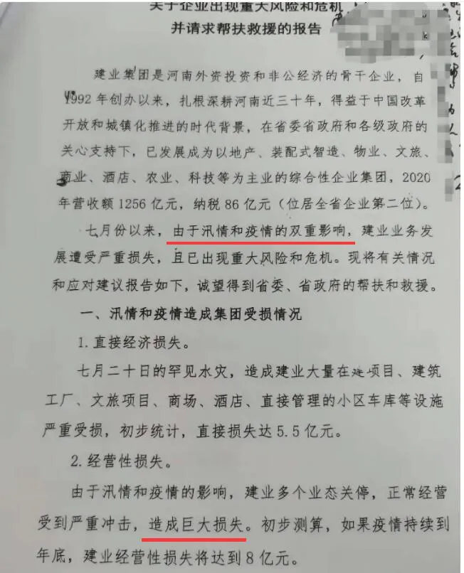 在7月份河南出現的汛情和疫情影響下,建業集團各種損失超過50億元。企業面臨“罕見的困難、風險和危機”,並“可能引發一系列社會問題”。