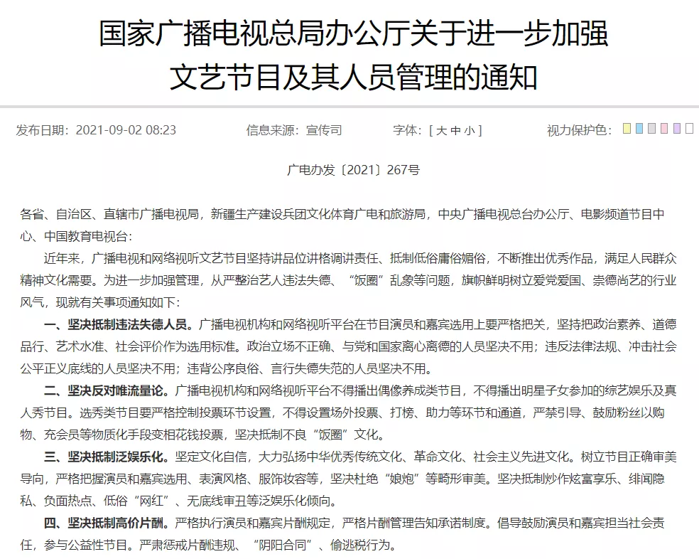 9月2日,廣電總局發佈《關於進一步加強文藝節目及其人員管理的通知》,要求廣播電視機構和網絡視聽平台不得播出偶像養成類節目,選秀類節目要嚴格控制投票環節設置,不得設置場外投票、打榜、助力等環節和通道,嚴禁引導、鼓勵粉絲以購物、充會員等物質手段變相花錢投票。