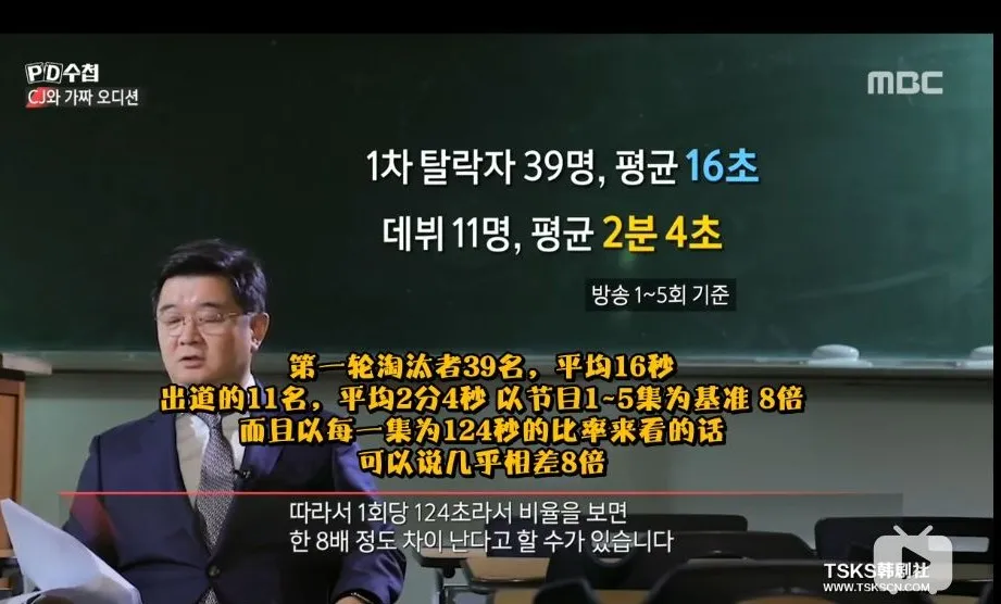 據韓國調查節目《PD手冊》,韓國市民團體和仁荷大學研究團隊對四季《PRODUCE》系列節目的前五集進行了統計,發現第一輪即淘汰的選手平均鏡頭僅16秒,而最終出道選手的平均鏡頭有2分4秒,相差近8倍。