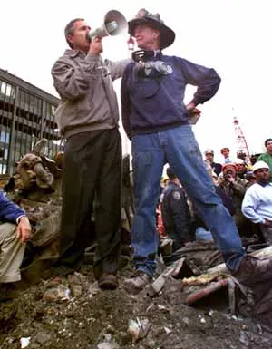 **▲**小布什站在世貿中心大廈廢墟上發表講話