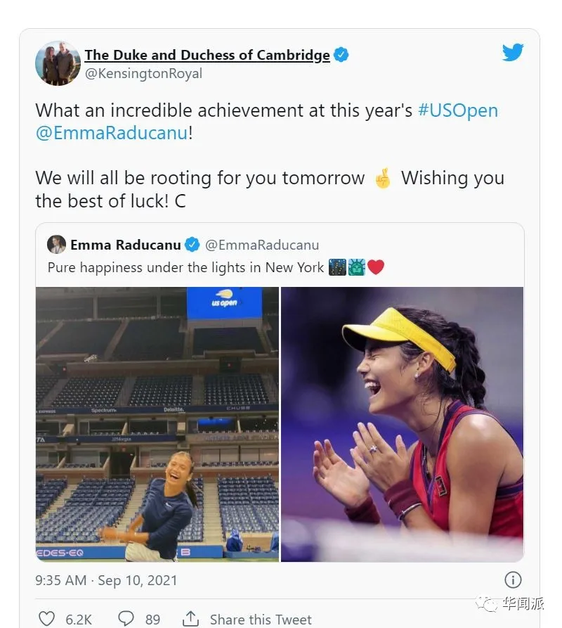 威廉王子夫婦轉發拉杜卡努的推特:“艾瑪·拉杜卡努在今年的美網取得了多麼令人難以置信的成就。我們明天都會為你加油,祝你好運!”