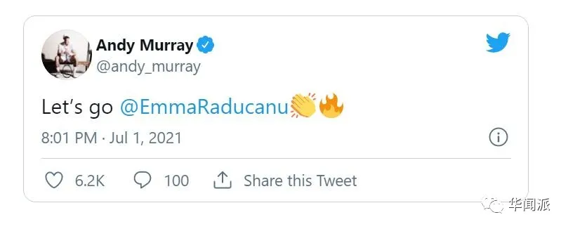 在拉杜卡努進入温網32強後,穆雷是第一個在推特上向她表示祝賀的名人。