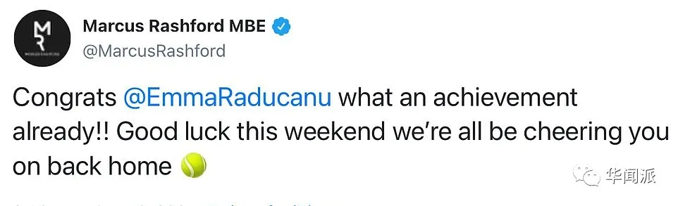 英格蘭足球名將拉什福德:“祝賀艾瑪·拉杜卡努取得如此成績!祝你在週末的決賽中好運,我們都會在家鄉為你加油。”