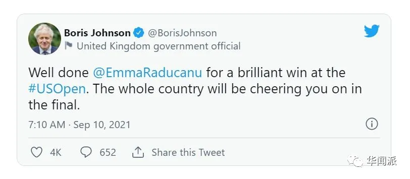 首相鮑里斯·約翰遜:“幹得好!艾瑪·拉杜卡努在美網取得了多麼輝煌的成績,全英上下都會在決賽中為你加油!”