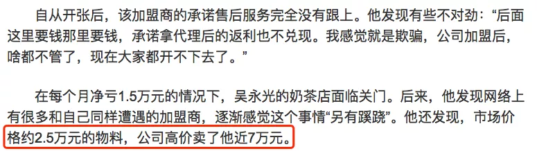 有加盟商爆料,這個品牌的原料市場價只有2.5萬,卻賣給他們7萬元。