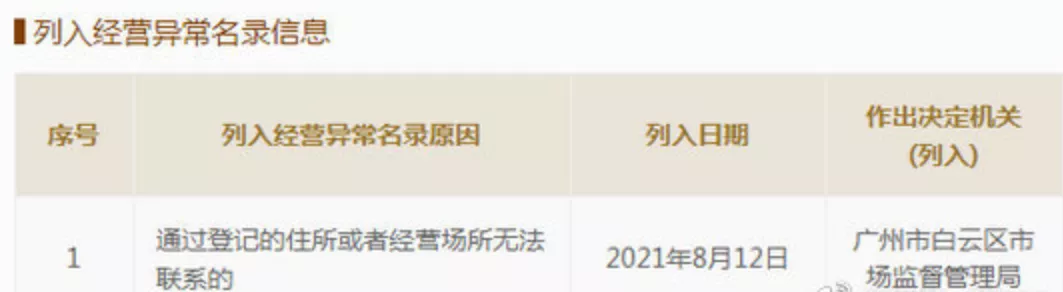 8月12日,有關部門就已經把品牌列入了經營異常的名單。