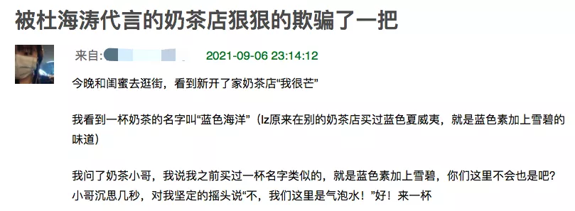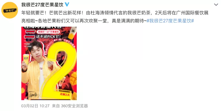 杜海濤代言了一個奶茶品牌“我很芒”。