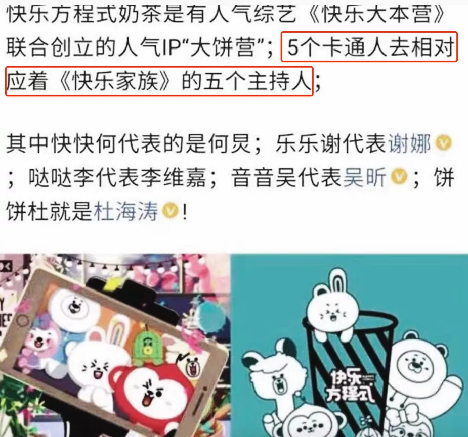 這個奶茶設計的logo也用了《快樂大本營》五位主持人的代表卡通形象。