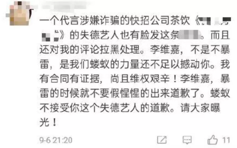 按照李維嘉聲明的説法,或許在法律上可以不用承擔責任,可他作為有影響力的公眾人物,用打擦邊球的方式推卸責任,每一句話都在往受騙者身上插刀。