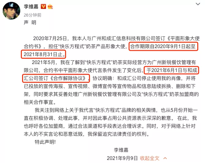 第一,合作期限是2020年9月1日—2021年8月31日,今天是2021年9月9日,我的代言已經到期了,跟我沒關係。
