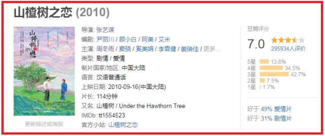 2010年,還在上高中的周冬雨,在一次體操訓練中的一個回眸,被張藝謀看中,讓其主演《山楂樹之戀》。