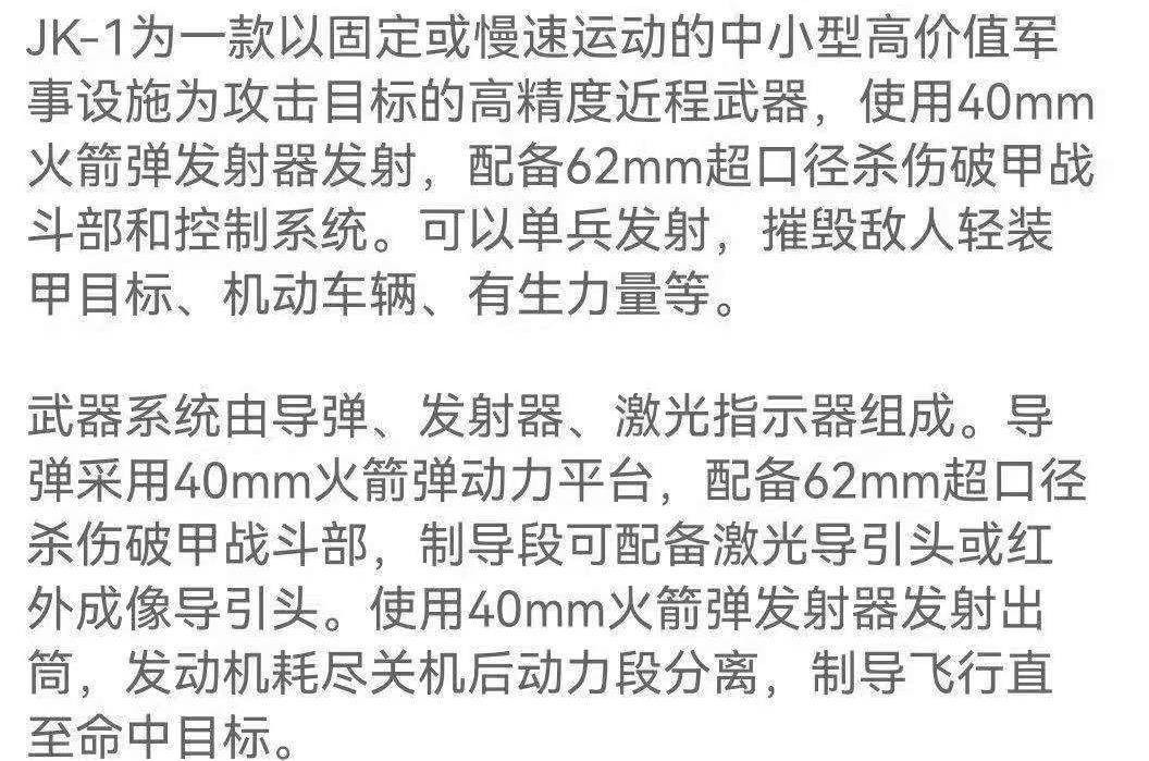 JK-1就是這樣的制導RPG,從相關介紹來看,JK-1保留了RPG火箭彈總體設計和內部結構,由40毫米固體火箭發動機和62毫米超口徑殺傷破甲戰鬥部組成。固體火箭發動機推動火箭彈出筒,賦予它初始動能。發動機耗盡之後動力段脱離,以減少風及氣流對火箭飛行的影響。JK-1火箭彈頂部安裝了制導系統,現在配備的是激光半主動制導系統,激光半主動制導系統制導精度高、技術成本、價格低廉,適合火箭彈這樣低成本消耗型武器。火箭彈上面也安裝了4個控制彈翼,以糾正飛行誤差。當然激光制導系統缺點就是受外界環境影響大,需要激光照射器始終照射目標。相關單位表示如果用户能夠接受成本,JK-1也可以換裝紅外成像制導系統,升級為發射後不用管的制導武器。