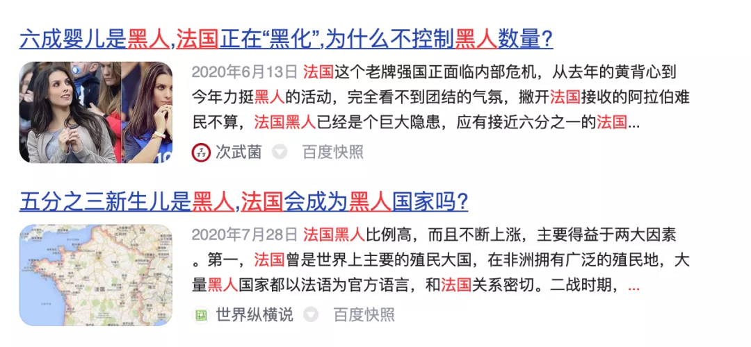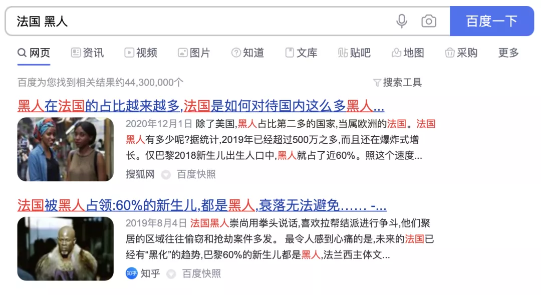 這個謠言從英語互聯網進口,在中國繼續被添油加醋,然後編成了一則離譜的信息,在中文互聯網廣泛傳播,以至於百度搜索法國+黑人,就能看到無數的這則謠言的各種各樣的版本。