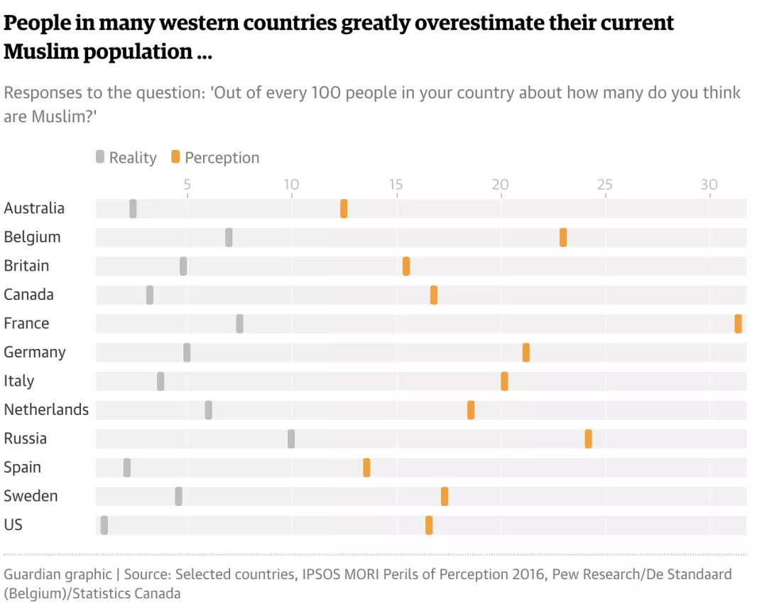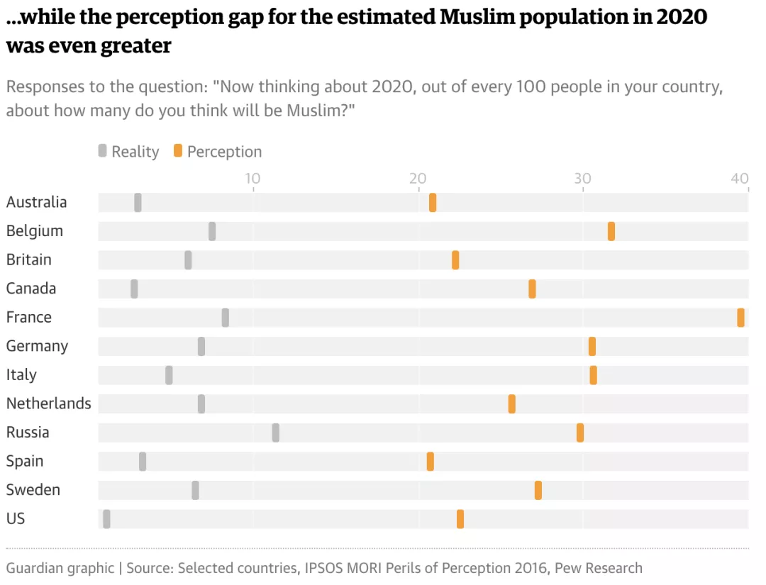 幾乎所有的國家都嚴重高估了本國穆斯林的人口比例。意大利和德國認為本國的穆斯林人口占比在20%左右,但實際情況僅僅是5%。英國人認為超過16%,而實際情況不到5%。美國的情況最極端,美國人認為自己國家有15%以上的人口是穆斯林,實際情況是隻有1%。