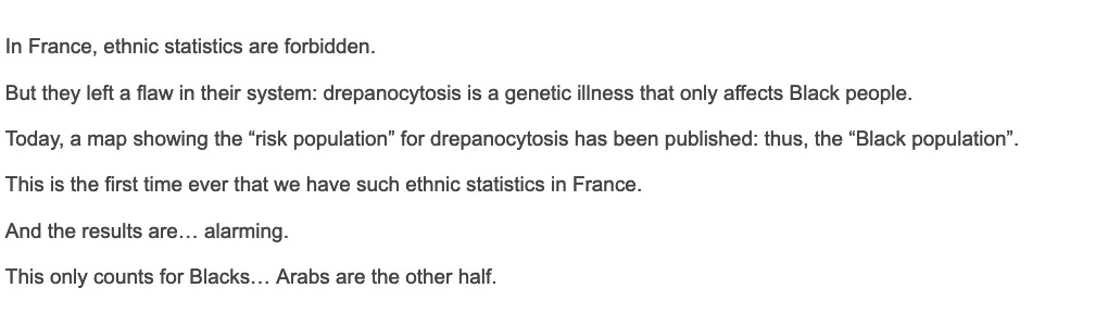今天聊一個比較有趣的話題。一則互聯網謠言 - “法國被黑人佔領,60%的法國新生兒都是黑人。” - 是怎麼產生的。