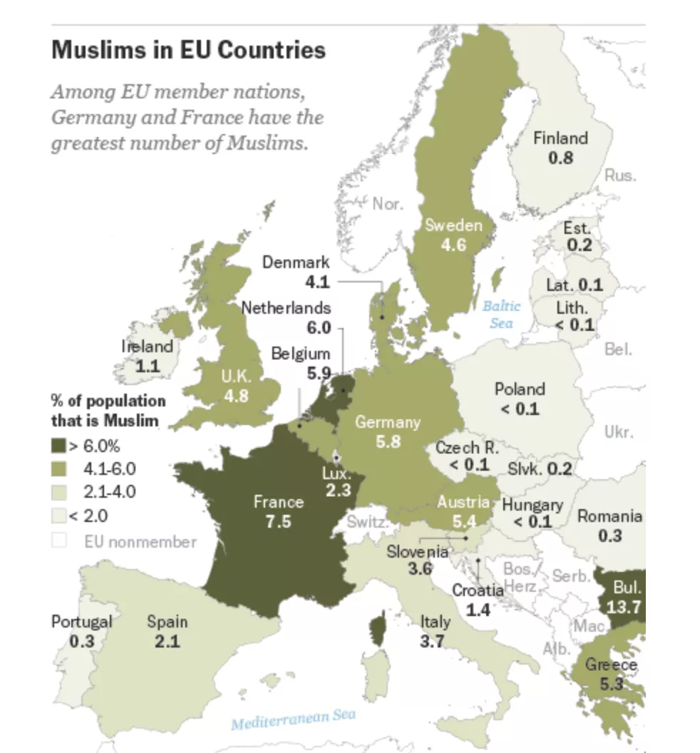 相對比較官方的數據,是2019年Eurobarometer 的一次調查,結論是法國的穆斯林人口占總人口的5%。Eurobarometer是1973年以來代表歐盟委員會和其他歐盟機構定期進行的一系列公眾意見調查,算是歐盟的官方調查機構。