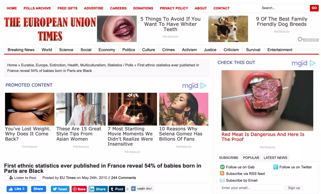 一家網絡媒體,EU Times, 在2010年5月24日發了一篇文章,題目是《法國首次公佈的種族統計數據顯示,在巴黎出生的嬰兒中有54%是黑人》