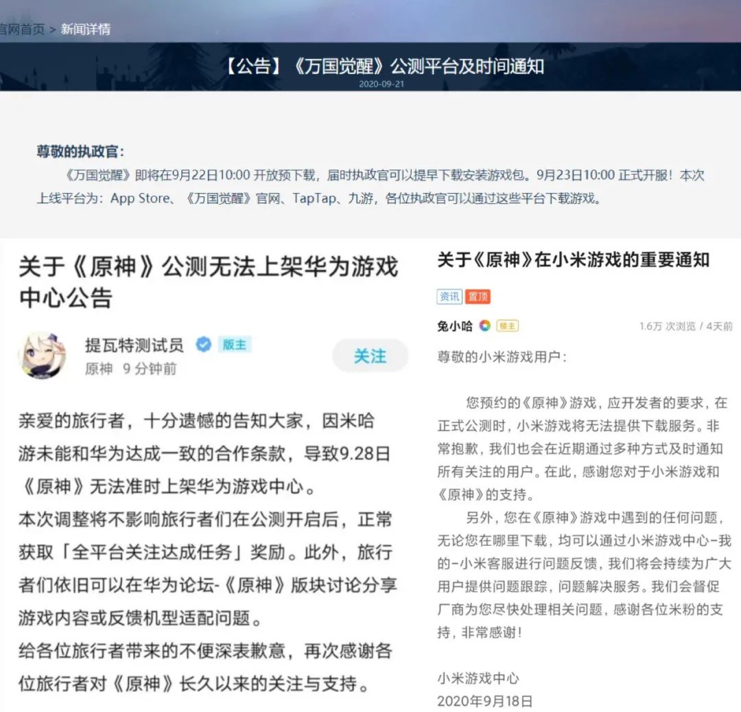 騰訊遊戲跟華為鬧掰並非無跡可循。此前,米哈遊《原神》、莉莉絲《萬國覺醒》相繼發佈公告稱,不上線華為、小米等傳統安卓渠道。