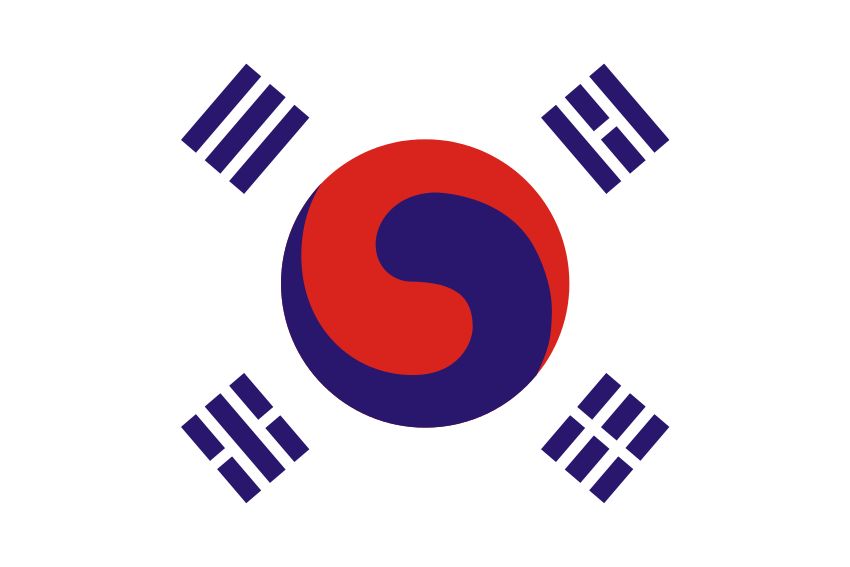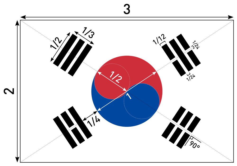 1948年,韓國政府成立之時就決定將太極旗作為國旗,並於1949年頒佈了製作標準——橫豎比例為3:2,具體細節見上圖。圖案和顏色——白底代表國土;太極圖象徵宇宙天地渾成,以及單一民族構成的國家;太極的圓代表人民;太極的兩儀上紅下藍,分別代表“陽”和“陰”。