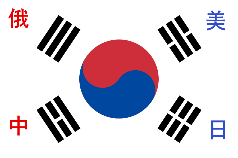 另一個現狀,則是半島局勢在很大程度上是由半島以外的四個大國決定的——中、美、蘇(俄)、日,就像四卦圍繞着太極一樣,不多也不少正好四個!至於哪一卦對應哪個國家,上圖只是一種“解法”,大家可充分發揮想象力,做出自己的解釋。