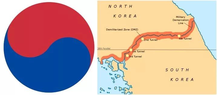 現狀之一,當然是分裂——太極旗上的太極,可不就是一分兩半嗎?而且上紅下藍,連顏色都很匹配,兩儀之間彎曲的分界,還真挺像現實中的軍事分界線。