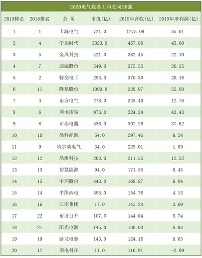再比如電力裝備,其實説的就是哈爾濱電氣,下圖是《能源》雜誌搞的2020年全國電氣設備公司上市20強,按照的是2019年的經營數據,東北地區主要是哈爾濱電氣排在第11位。