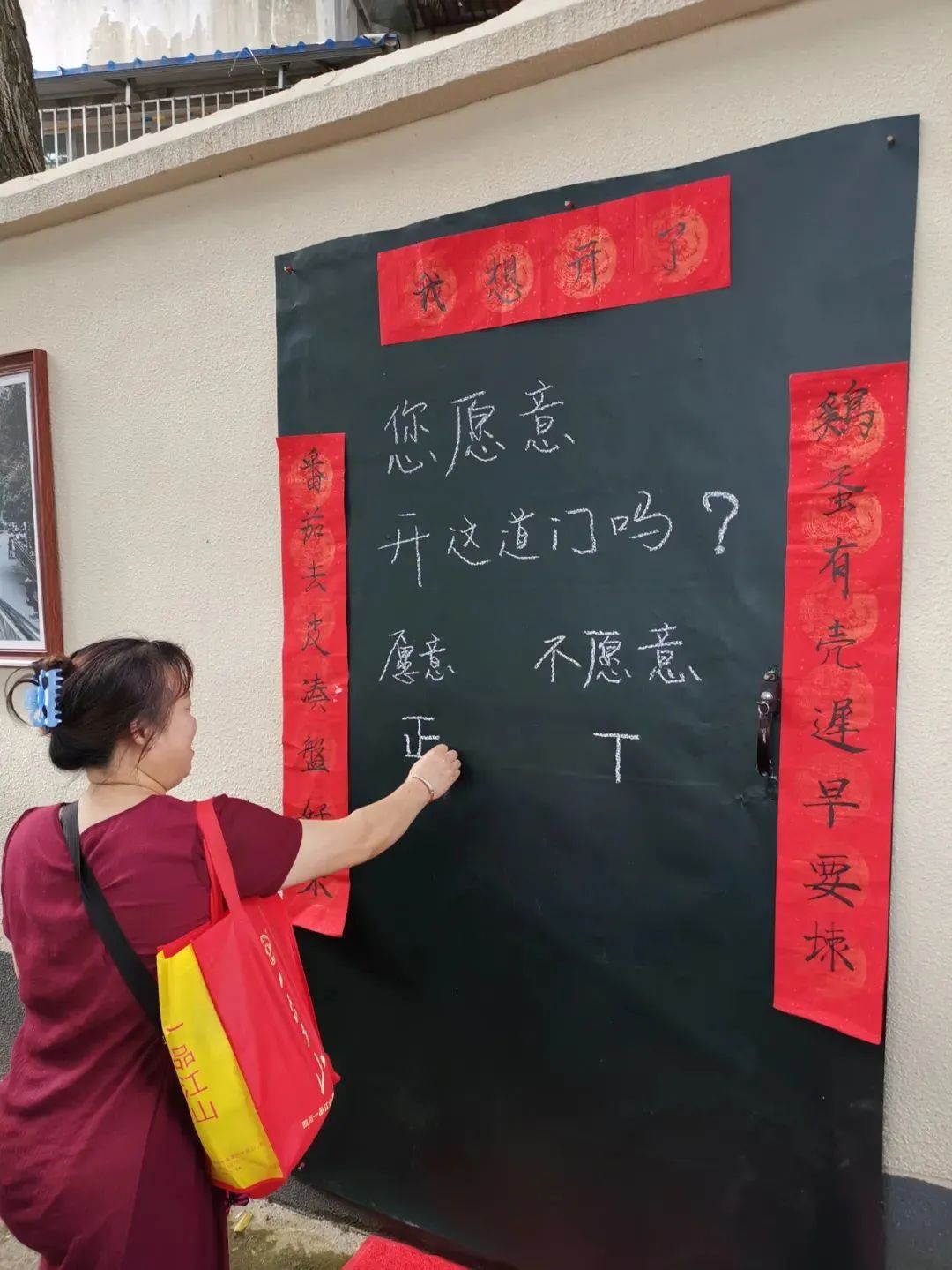 小區相鄰的牆上,工作坊參加者們在想象中“門”的位置貼上象徵跑道的紅紙。相鄰院落的人看到這個通向藍天的跑道,也在暢想一個沒有牆壁隔閡的未來。小區居民可以隨時在門上“想開”和“不想開”的詞條下畫“正”字,如今“想開”的“正”字已在不斷增多。