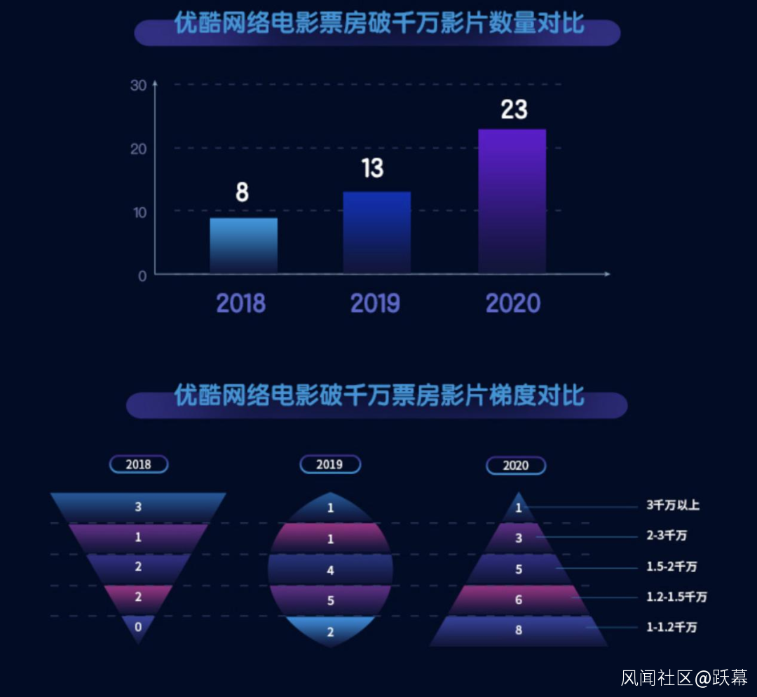 從目前整個網絡電影的產業發展來看,院線電影和網絡電影在多個發展特徵上逐漸吻合。例如,2020年優酷上線了23部票房破千萬的網絡電影,同比2019年增加了77%。頭部化和類型化,成為了當下網絡電影的兩大特徵。而反觀院線電影市場,頭部化和類型化同樣是疫情後兩大市場標籤。