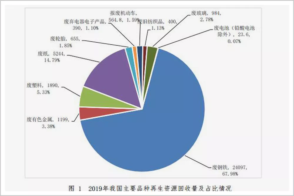 據商務部《中國再生資源回收行業發展報告(2020)》,我國可再生資源回收主要集中在廢鋼鐵、廢有色金屬、廢塑料、廢輪胎、廢紙、廢棄電器電子產品、報廢機動車、廢舊紡織品、廢玻璃、廢電池等領域,2019年底,它們的回收總量超過3.5億噸。