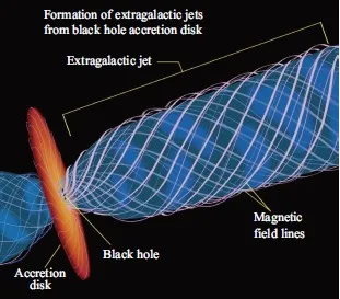像本次拍攝的“模特”,M87中心黑洞早先就被觀察到有噴流現象。關於噴流產生的機制仍不清楚,目前的猜想是被黑洞俘獲的等離子的磁場隨等離子體向黑洞旋轉靠近,形成螺旋結構,一些未墜入黑洞的等離子體有可能順着磁力線改變方向離開黑洞,並被磁場準直加速,形成高速等離子流,從黑洞附近噴射而出。