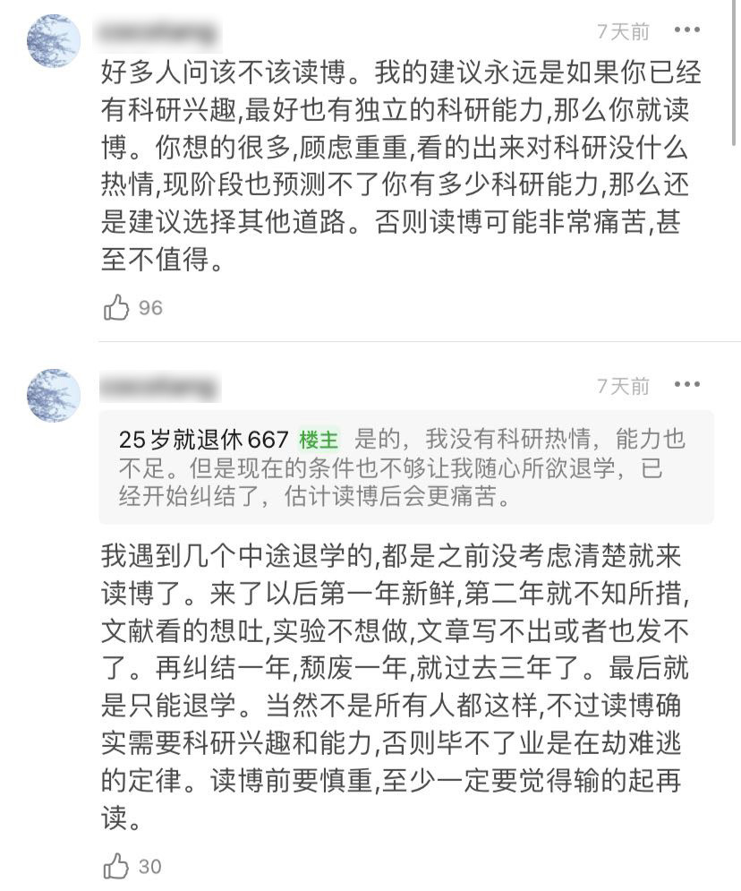 看評論區有人説,自己遇到過幾箇中途退學的,都是沒考慮清楚就來讀博了,第一天還新鮮,第二年就不知所措了。