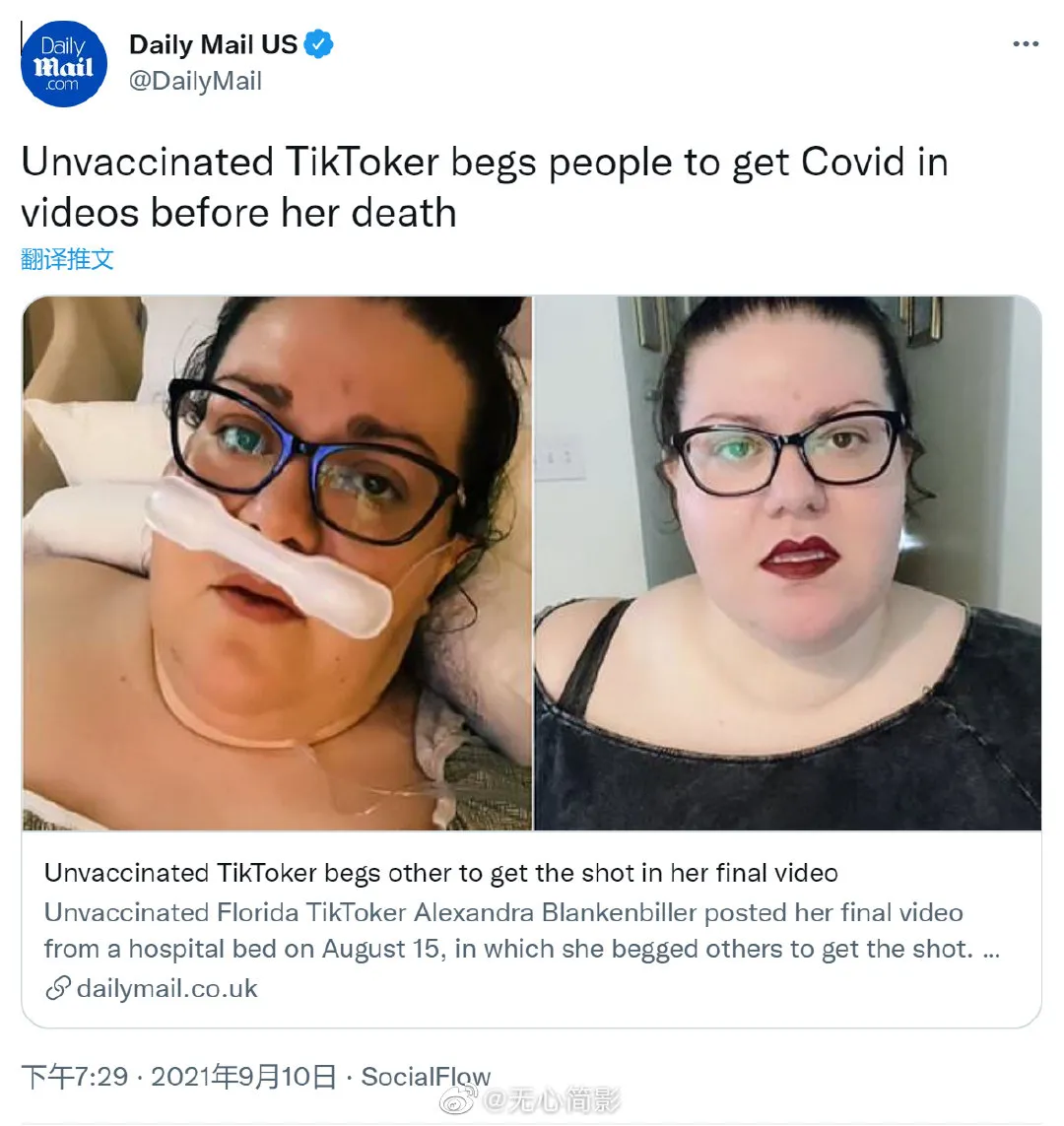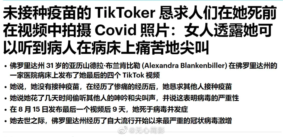 美國佛羅里達,一名31歲的抖音主播感染了新冠病毒,然後她在生命中的最後幾天裏,用抖音視頻記錄了她在病房裏見到的一切——其他病人的呻吟和尖叫,然後她開始懇求其他人接種疫苗。