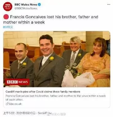 英國威爾斯,一男子全家都相信陰謀論而拒絕打疫苗,結果他的父母,弟弟在一起聚餐時全部確診,一週內全部去世,瞬間痛失家人的他現在決定挺身呼籲大眾快去打疫苗,