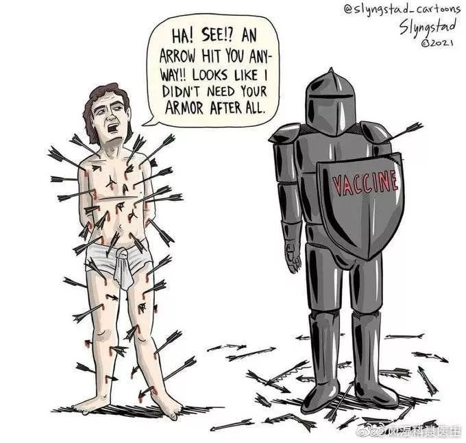 另一個人接種了疫苗=戴着盔甲來對抗病毒。但身上還是被射中了一箭,雖不是致命傷。