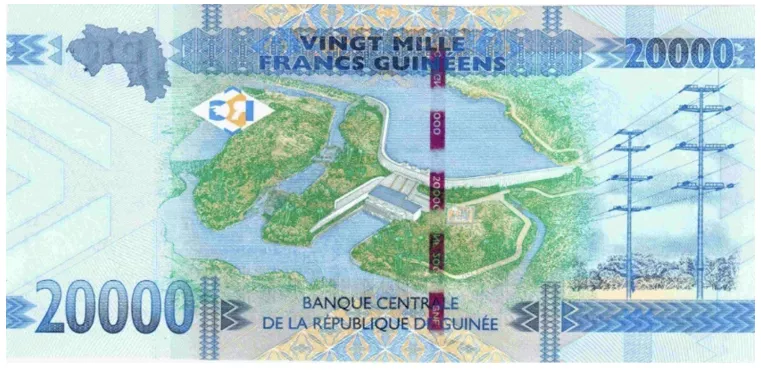 在幾內亞新、舊兩版5000法郎,20000髮廊的背面,印有中國修建的金康、凱樂塔水電站的效果圖。