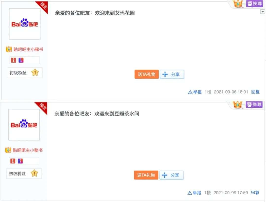 9月6日,即豆瓣限制評論功能的當天,百度貼吧內同時出現了多個豆瓣頭部娛樂八卦小組的同名貼吧,包括自由吃瓜基地吧、鵝組吧、艾瑪花園吧、豆瓣茶水間吧、豆瓣踩組吧等。後續幾天中,也陸續有豆瓣娛樂八卦小組的同名貼吧出現。