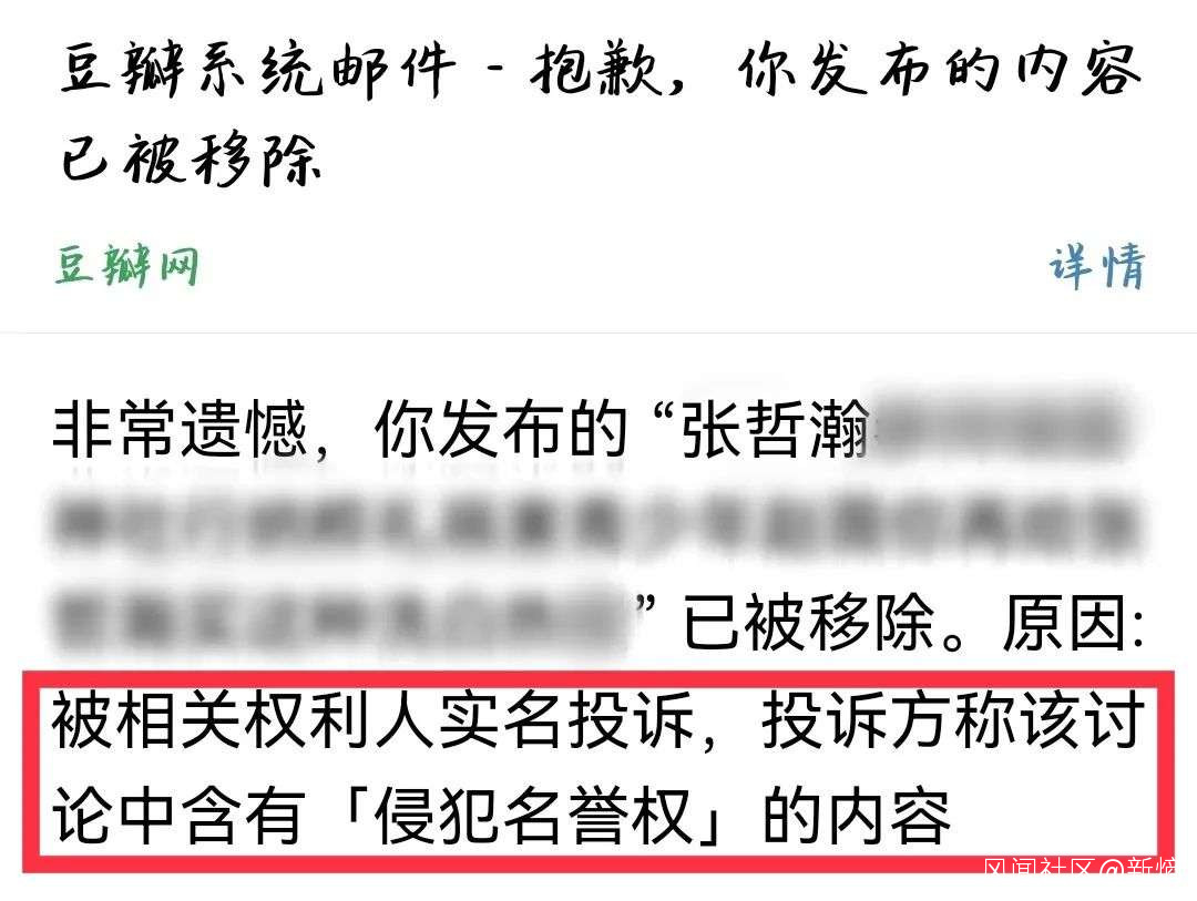 經常有豆瓣吃瓜羣眾吐槽,自己所發帖子被刪後,平台明確提示原因為“被相關權利人實名投訴”。這説明,需要明星本人或其團隊親自到豆瓣舉報,平台才會對明星的八卦內容或攻擊性評價進行處理。以至於豆瓣人經常嘲諷明星“舉着身份證實名舉報”。