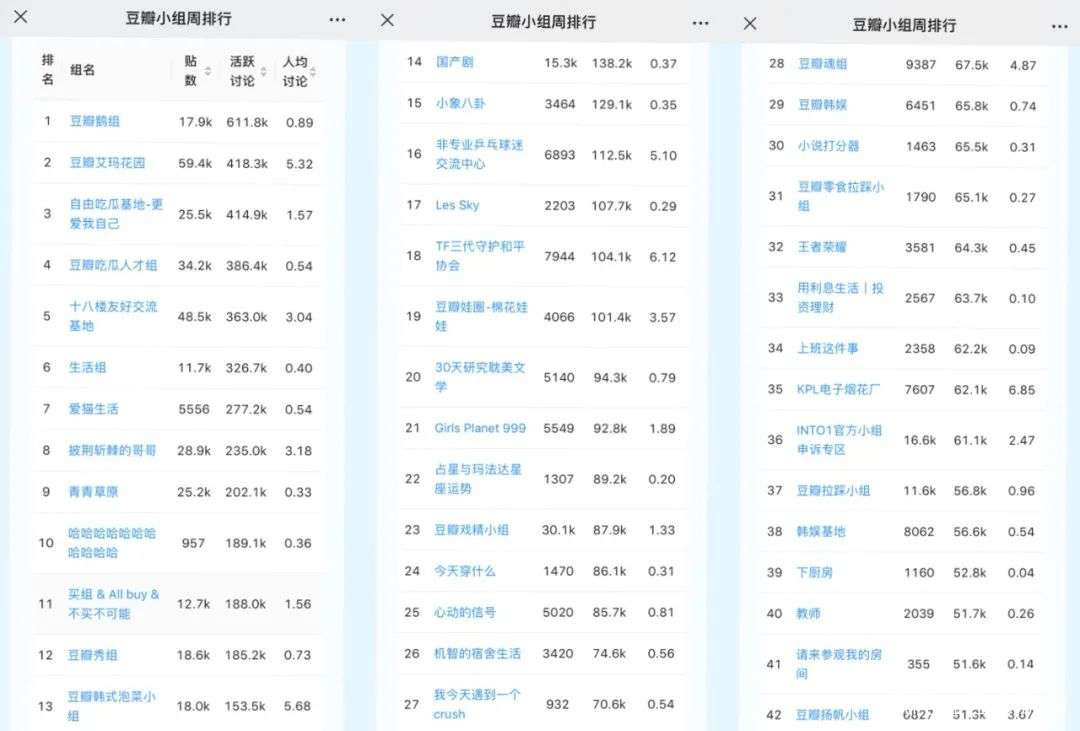 即便豆瓣使用多方位措施,對娛樂類小組進行限流,但該類小組依然流量兇猛。豆瓣小組周排行數據顯示,9月第一週(8月29日至9月4日),豆瓣活躍討論數前5的小組,全部為娛樂類小組。