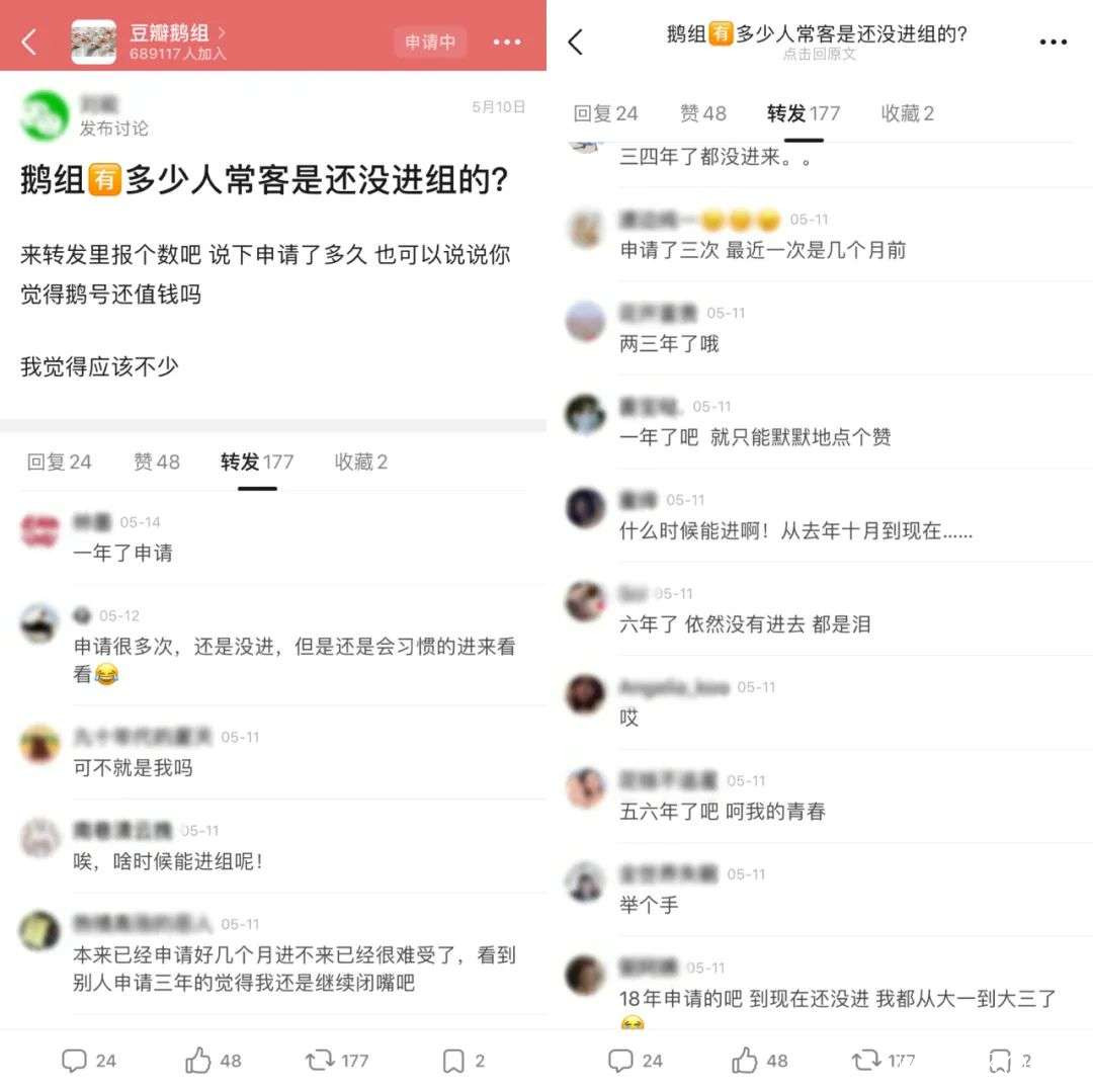 豆瓣的幾大娛樂小組,入組門檻極高,有的需要答題,有的需要用户有足夠的活躍度,即便申請者滿足這兩項要求,也可能卡在搖號進組這一關。由於申請人數眾多,部分娛樂小組實行搖號制,以至於經常有人吐槽申請五六年了仍未進組。