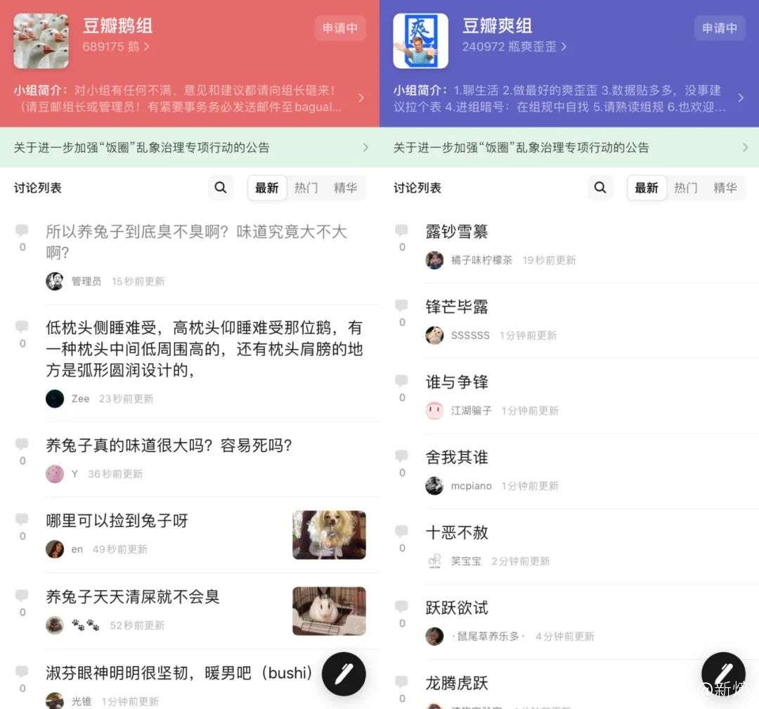 反觀青青草原的組規中,明確強調了“不造謠不傳謠”等具體標準;豆瓣鵝組的組規中,附加了豆瓣小組官方賬號發佈的《豆瓣鵝組發言規則》。有豆瓣用户告訴「新熵」,2019年豆瓣官方接手了鵝組,此後該組由平台直接管理。