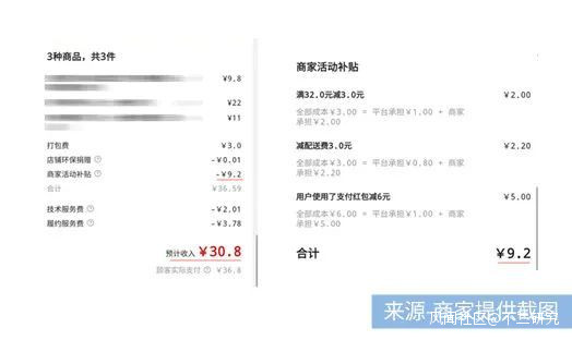 以一單鴨貨外賣為例,顧客點單總價45.8元,減去共計9.21元的店鋪環保捐贈和商家活動補貼,再減去共計5.79元的佣金,最後預計收入只有30.8元。