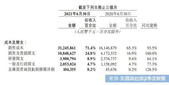 美團2021Q2財報顯示,二季度銷售成本為312.46億元,同比增加93.5%。