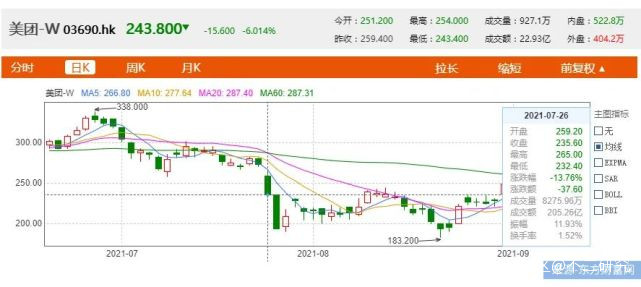 截止9月13日收盤,美團股價為 247.8港元,總市值 1.52萬億港元,市值距高點蒸發超1.3萬億港元。