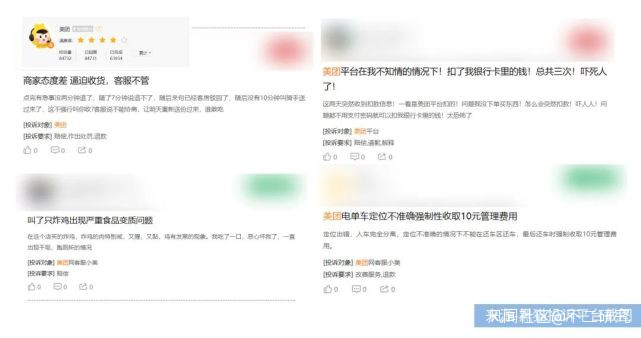 除此之外,黑貓投訴上有關美團的投訴內容五花八門:食品變質、服務態度差,虛假營銷,甚至電影票買完就降價、共享單車定位不準亂扣管理費等等。